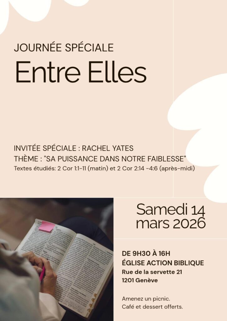 Entre Elles se réunit un samedi par mois de 09h30 à 11h30 dans les locaux de l’église pour un temps de partage et d’enseignement de la Bible.